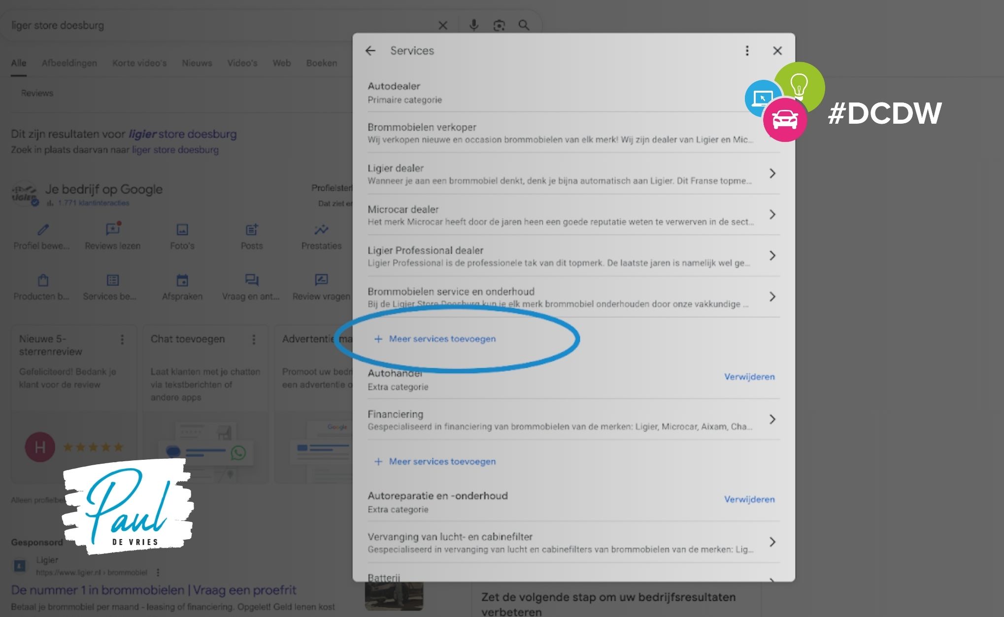 For us, ‘car dealer’ is the primary category, since there is no ‘Ligier dealer’ category. That category I need to polish. I do this by clicking ‘add more services’. See below: