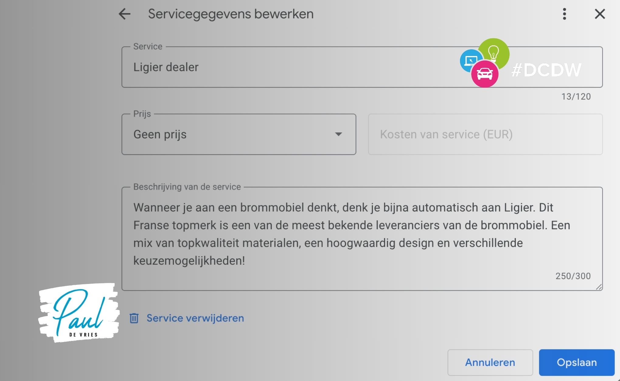After selecting ‘Ligier dealer’, you can add your own description. That is the beauty of it. For example: