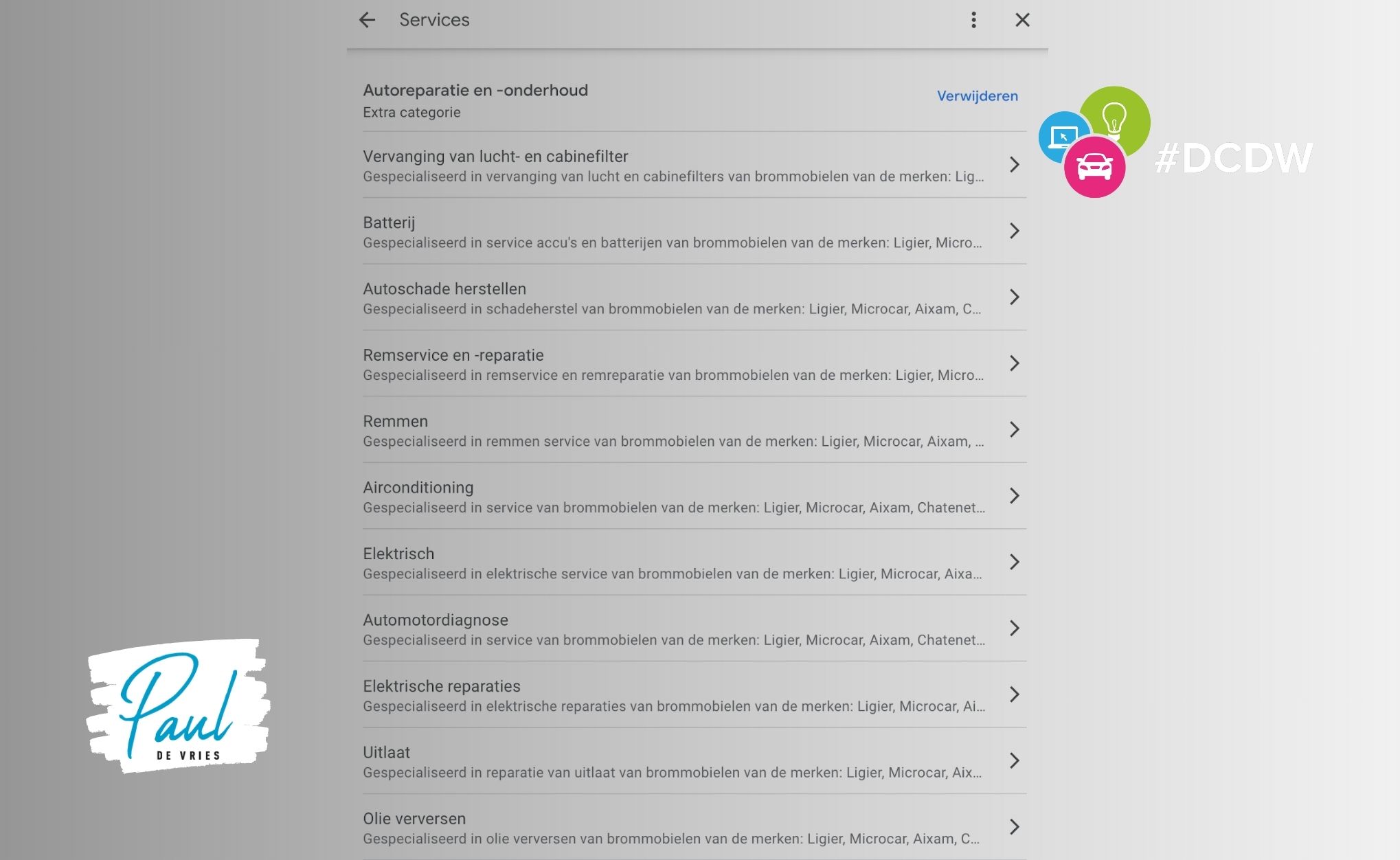 Under the category ‘car repair and maintenance’, I created all kinds of services relevant to this category. For example, air conditioning, exhaust, and brakes, with the addition that it concerns microcars.